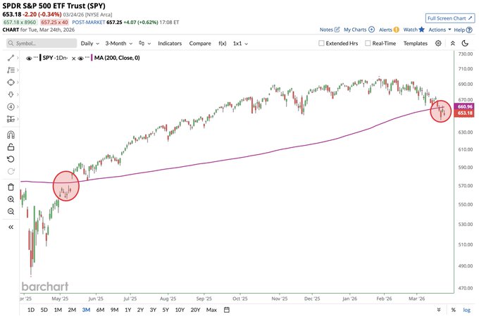 S&P 500 $SPY closed below its 200-day moving average for 4 consecutive days, the longest streak since May π