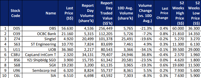 $DBS(D05.SI)$ $OCBC Bank(O39.SI)$ $Singtel(Z74.SI)$ $ST Engineering(S63.SI)$ $UOB(U11.SI)$ $CapLand IntCom T(C38U.SI)$ $YZJ Shipbldg SGD(BS6.SI)$ $SGX(S68.SI)$ $Sembcorp Ind(U96.SI)$ $SIA(C6L.SI)$