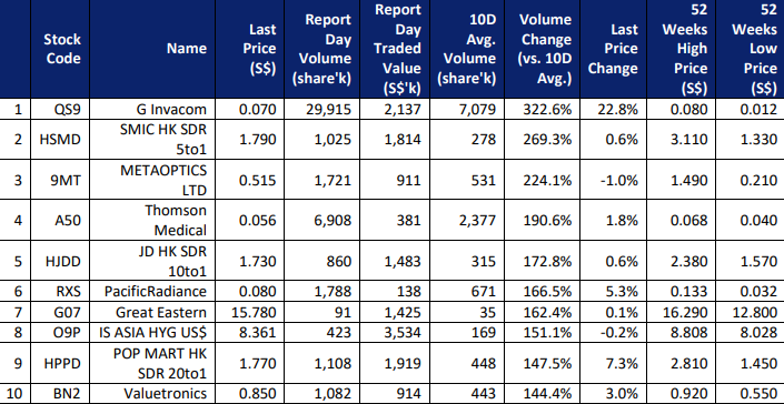 $G Invacom(QS9.SI)$ $SMIC HK SDR 5to1(HSMD.SI)$ $METAOPTICS LTD(9MT.SI)$ $Thomson Medical(A50.SI)$ $JD HK SDR 10to1(HJDD.SI)$ $PacificRadiance(RXS.SI)$ $Great Eastern(G07.SI)$ $IS ASIA HYG US$(O9P.SI)$ $POP MART HK SDR 20to1(HPPD.SI)$ $Valuetronics(BN2.SI)$