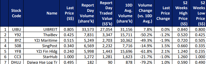 $UIBREIT(UIBU.SI)$ $ThaiBev(Y92.SI)$ $YZJ Maritime(8YZ.SI)$ $SingPost(S08.SI)$ $YZJ Fin Hldg(YF8.SI)$ $StarHub(CC3.SI)$ $Daiwa Hse Log Tr(DHLU.SI)$