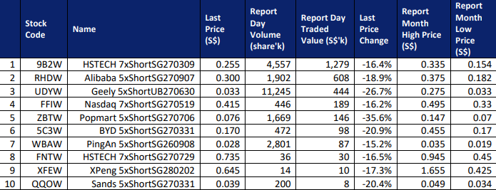 $HSTECH 7xShortSG270309(9B2W.SI)$ $Alibaba 5xShortSG270907(RHDW.SI)$ $Geely 5xShortUB270630(UDYW.SI)$ $Nasdaq 7xShortSG270519(FFIW.SI)$ $Popmart 5xShortSG270706(ZBTW.SI)$ $BYD 5xShortSG270331(5C3W.SI)$ $PingAn 5xShortSG260908(WBAW.SI)$ $HSTECH 7xShortSG270729(FNTW.SI)$ $XPeng 5xShortSG280202(XFEW.SI)$ $Sands 5xShortSG270331(QQOW.SI)$