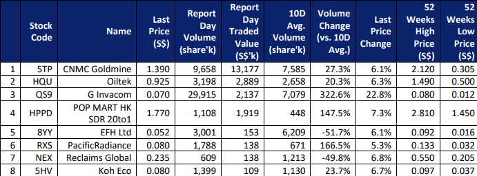 $CNMC Goldmine(5TP.SI)$ $Oiltek(HQU.SI)$ $G Invacom(QS9.SI)$ $POP MART HK SDR 20to1(HPPD.SI)$ $EFH Ltd(8YY.SI)$ $PacificRadiance(RXS.SI)$ $Reclaims Global(NEX.SI)$ $Koh Eco(5HV.SI)$