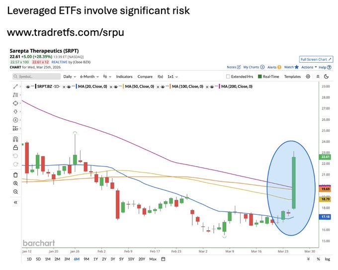 Sarepta Therapeutics soars by more than 28% today, on track for its 3rd best day this decade π¨ $SRPT has also jumped above all its major moving averages β Will the strength continue? For magnified exposure, consider the Tradr 2X Long SRPT Daily ETF $SRPU