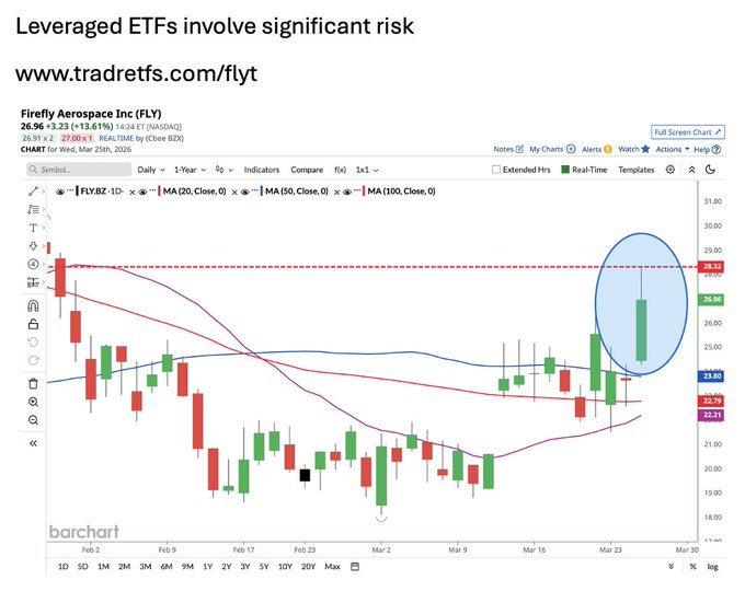 Firefly Aerospace $FLY on track for its 3rd best day ever after scoring a $33 price target from Morgan Stanley π¨ $FLY has jumped above its 20D, 50D, and 100D moving averages β What's next? For magnified exposure, consider the Tradr 2X Long FLY Daily ETF $FLYT