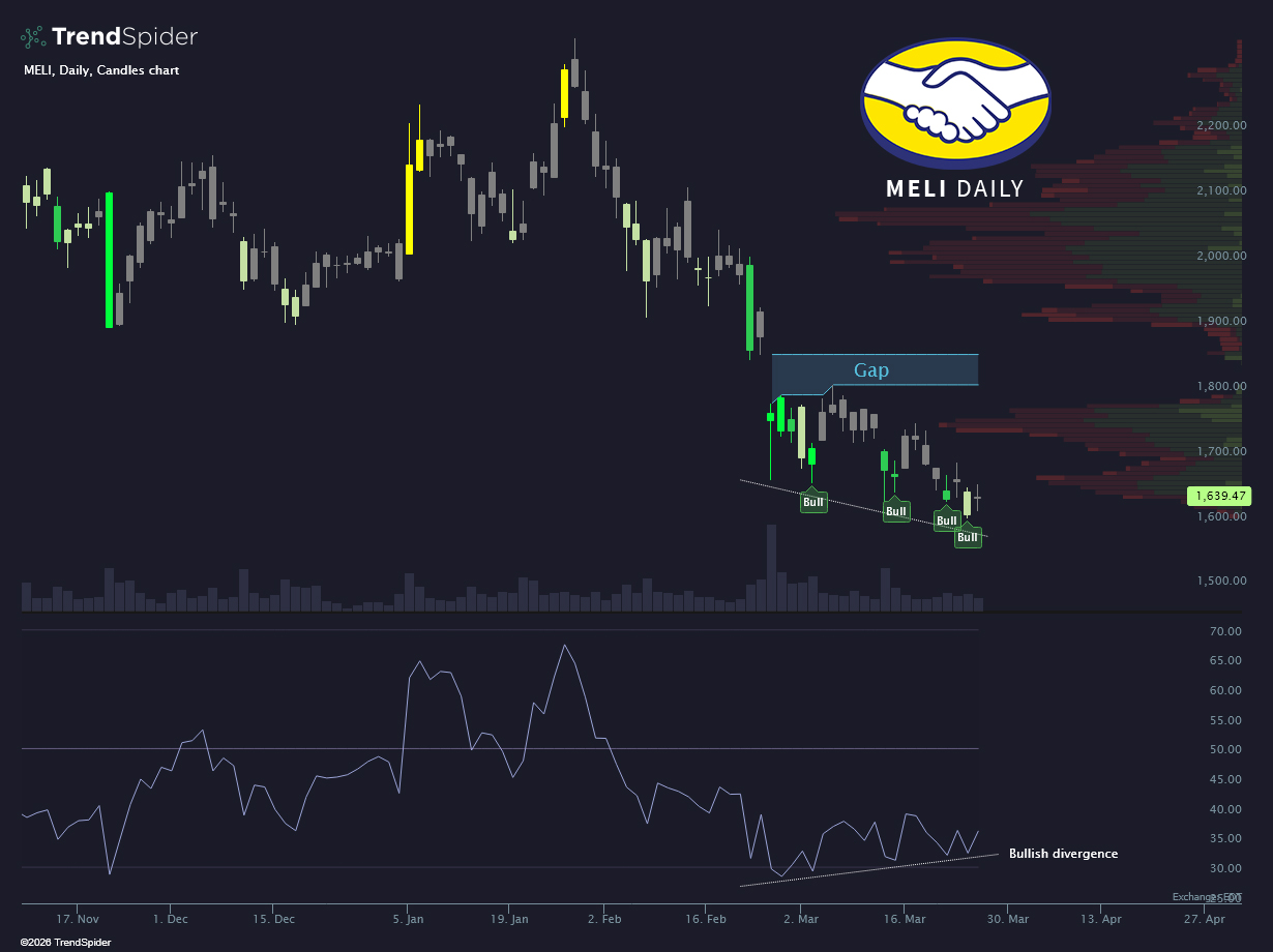 Bullish divergences quietly stacking on $MercadoLibre(MELI)$ with a gap hanging overhead