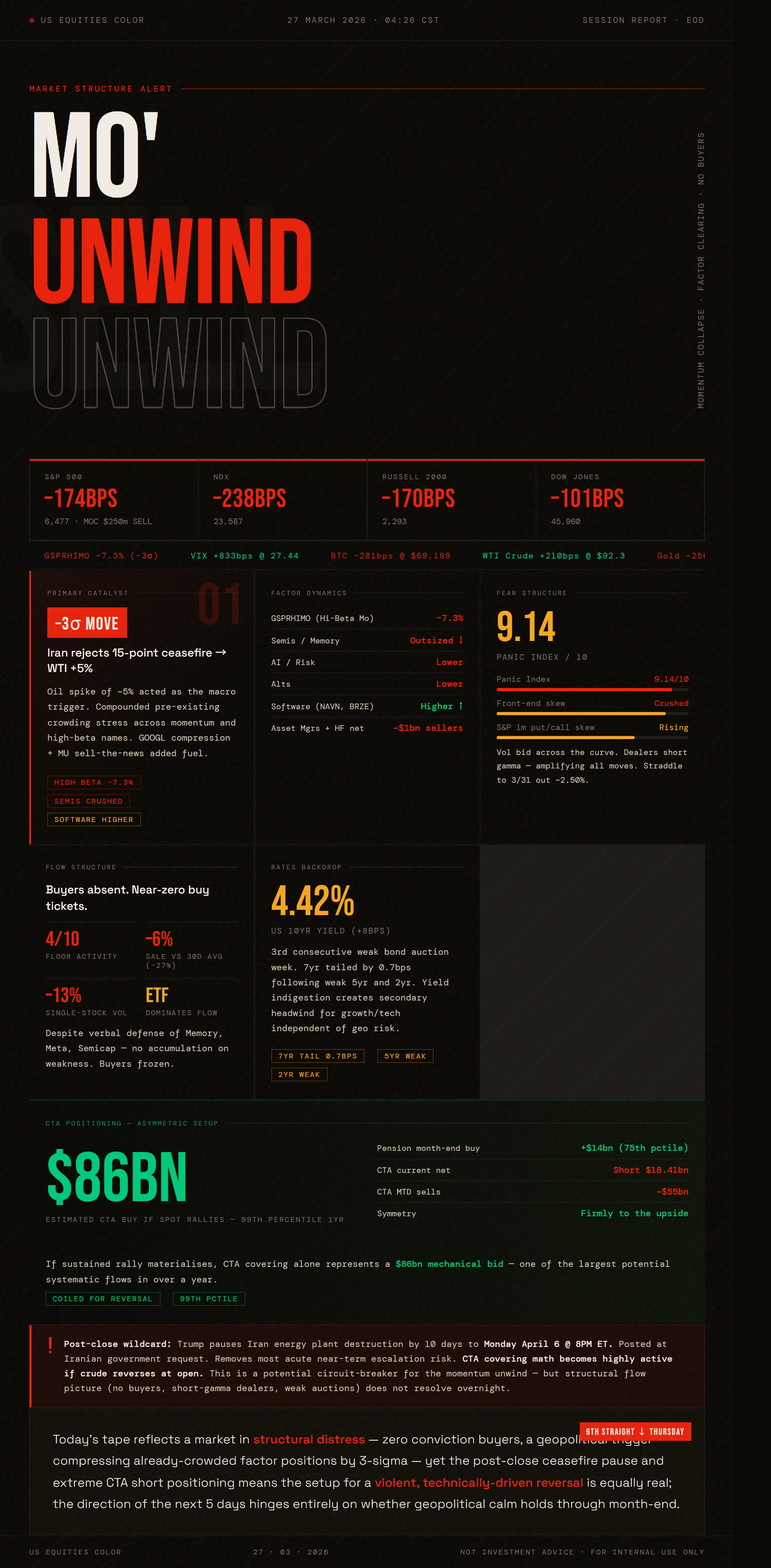 The post-close Trump statement on Iran is the wildcard that changes everything. The 10-day pause removes the immediate catalyst that sparked today's 5% crude spike. If crude unwinds even partially at open tomorrow, the technical setup — dealers short gamma, CTAs massively short — creates a feedback loop to the upside that could be significant.