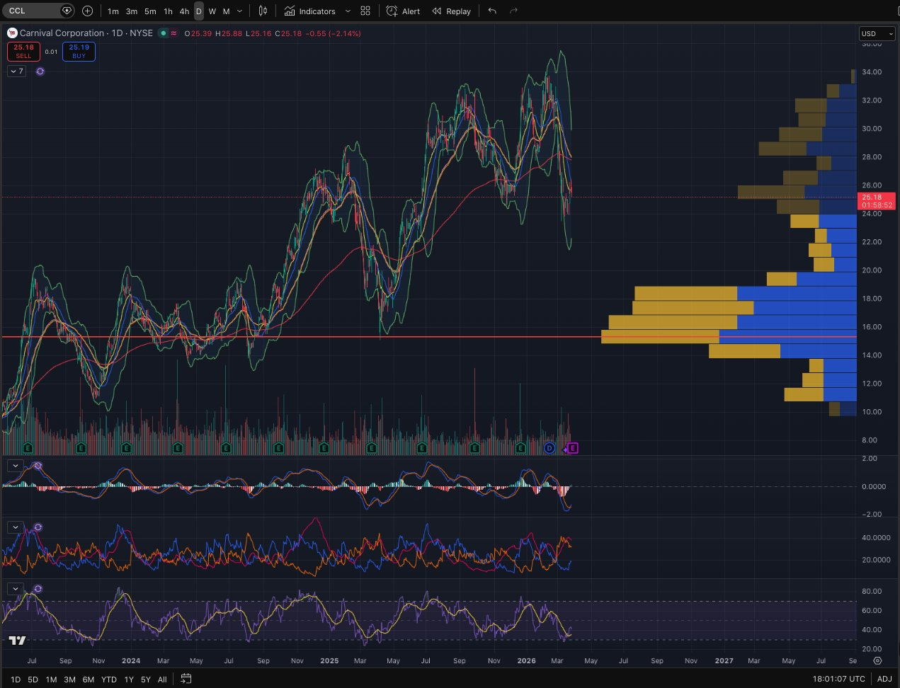 $Carnival(CCL)$ announces earnings before the opening bell tomorrow (Friday). Expected move is 6%. Strong volume cluster in that 15-19 range, with point-of-control near 15.