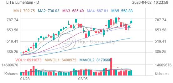 LITE closed at $764.65 on 2026-04-01, surging +8.81% ($61.89). It is now within 5.5% of its 52-week high of $808.80.