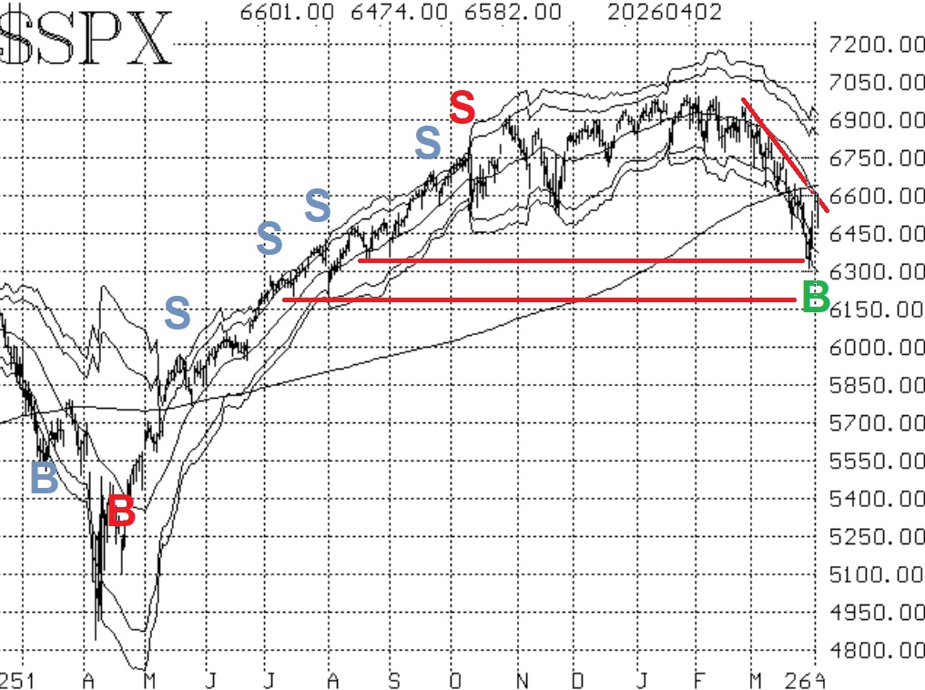 The rally (so far) reached as high as 6610. There are a number of potential resistance points in that area. First is the 200-day Moving Average, which $SPX is now approaching from below. Perhaps more important is the declining 20-day Moving Average, which is typically our target for the extent of an oversold rally. The 20-day MA has just crossed below the 200-day MA and is at about 6600. In addition, throughout March there were several days where the daily high or low was in this area as well. All of these are technical resistance points.