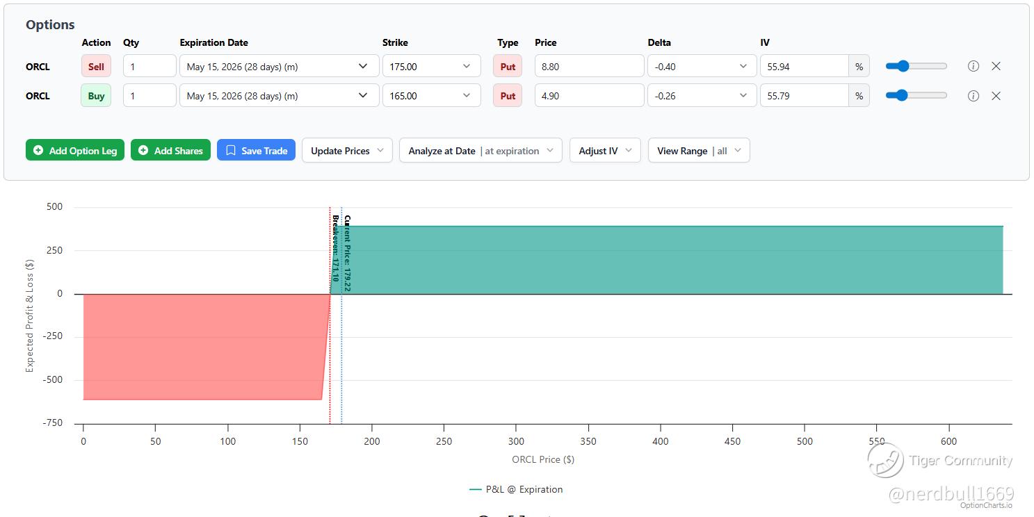 Earnings Safety: Crucially, Oracle's next earnings report is expected in mid-June 2026. By choosing a May 15 expiration, you are avoiding the high-risk "earnings lottery" entirely, allowing you to profit from time decay (theta) without a sudden post-earnings crash.