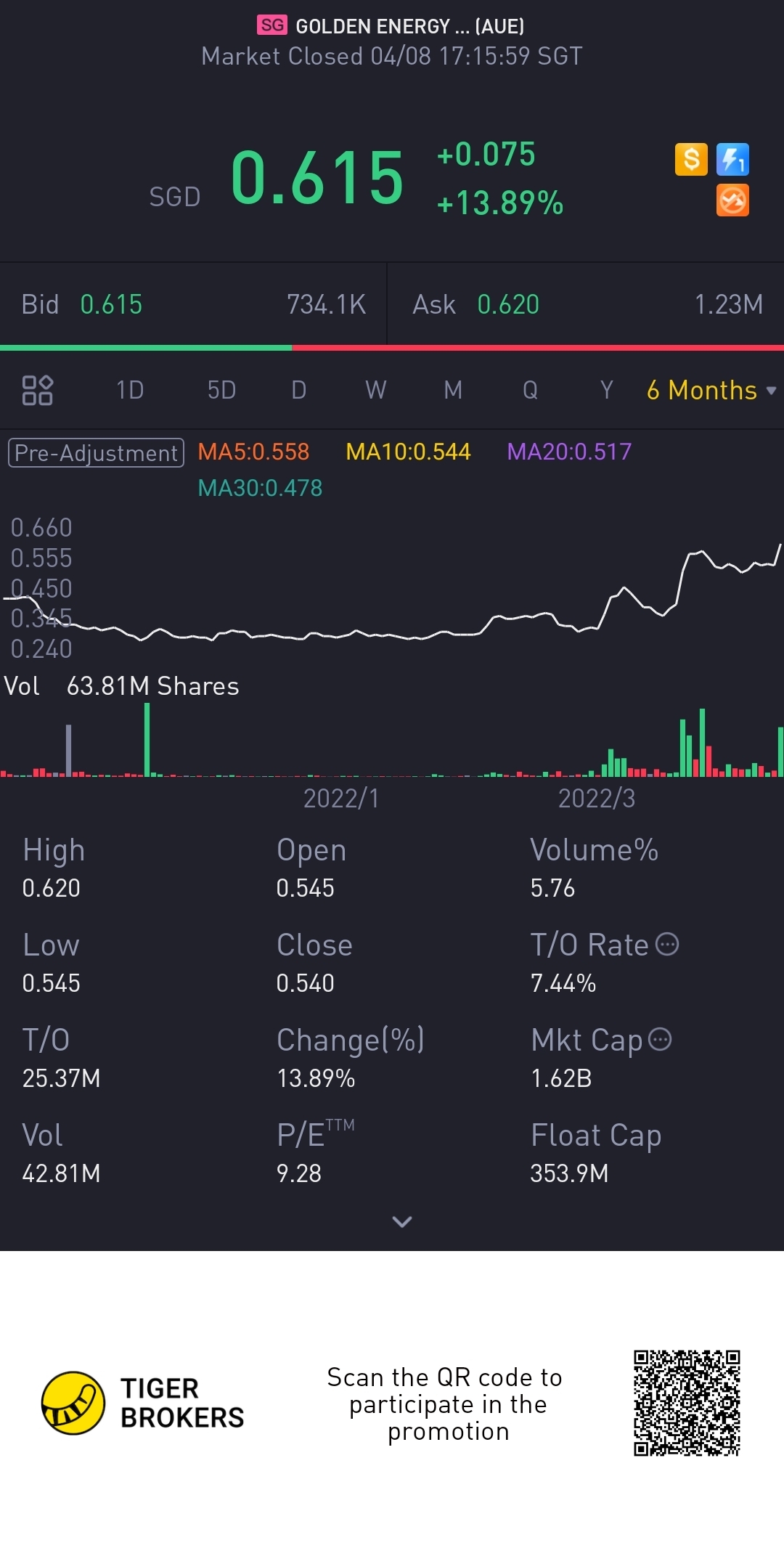$GOLDEN ENERGY AND RESOURCESLTD(AUE.SI)$too progressive. Don't think its stopping it climb up