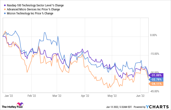 The sharp decline in tech stocks has brought some high-flying names crashing into the ground this year. The likes of Micron Technology$Micron Technology(MU)$ (MU-0.24%) and amd$AMD(AMD)$ have borne the brunt of the stock market sell-off in 2022.