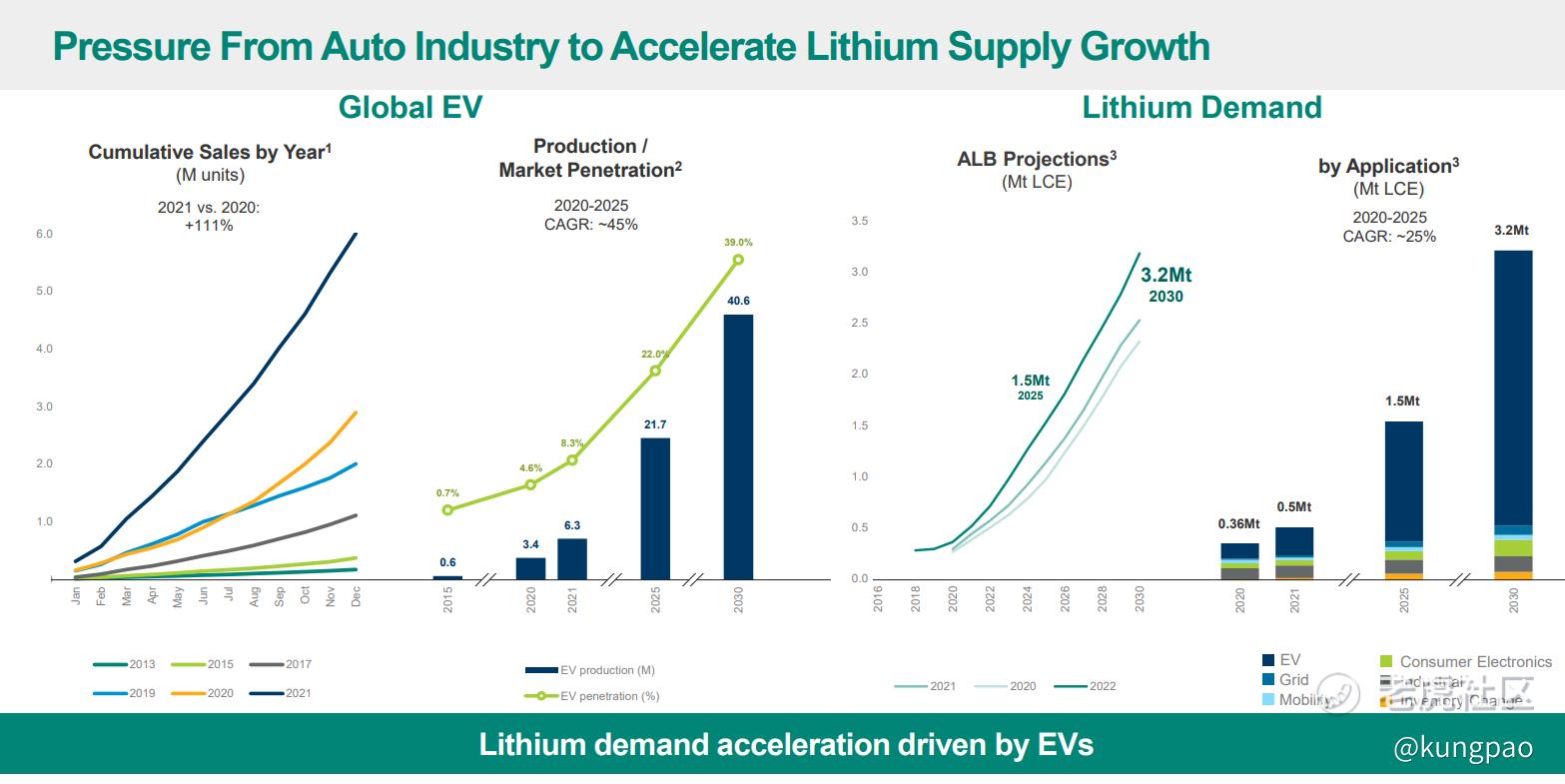 By 2025, annual demand for lithium will to rise to 1.5 million metric tons of lithium carbonate equivalent - up from about 500,000 metric tons used in 2021. ALB will benefit from increased demand, both in volume and in lithium prices.