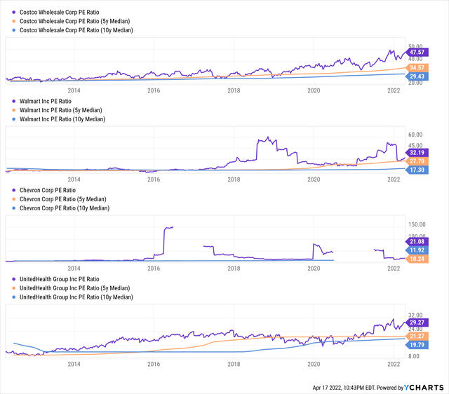 Unfortunately, that boat has sailed way too far off the shore to get onboard. Defensive "value" names like Costco (COST), Walmart (WMT), Chevron (CVX), or UnitedHealth (UNH) are all trading way above their historical averages. The markets are forward-looking, and there's no way we will make money in the next 3-5 years by buying Costco at ~48x P/E.