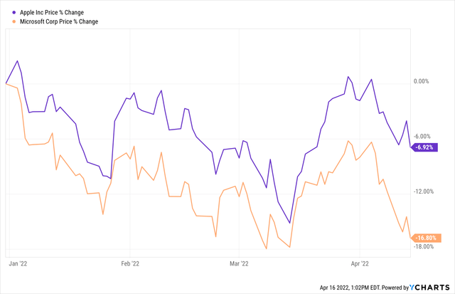 - While most tech stocks have been hammered for months and remain in a vicious bear market, Apple and Microsoft have held up quite well due to their safe-haven status.