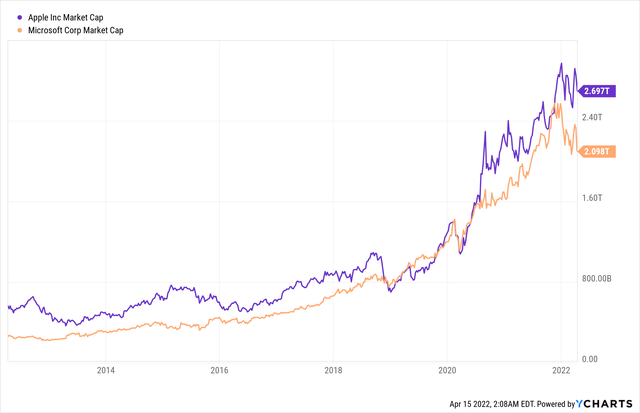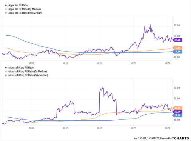 While Apple and Microsoft have been fantastic vehicles of wealth creation over the last decade or so, they're unlikely to repeat the feat over the next decade. For the long-term (5-10 years), I expect both Apple and Microsoft to deliver market-like (SPY) ~10-12% CAGR returns. However, I do not think these safe havens are safe for the medium-term (2-3 years). Why?