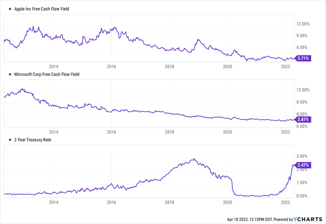 The business fundamentals for Apple and Microsoft have never been stronger. However, their valuations are pretty rich. With treasury yields surging higher, Apple and Microsoft are becoming less attractive to investors looking for safety in the face of multi-decade high inflation and the growing threat of an economic recession. The 2-Yr [2.5%], 10-Yr [2.9%], and 30-Yr [3%] treasuries have climbed to three-year highs, which is enough to change the math for investors. If the risk-free rate goes up to 3.5-4%, why would a sane investor buy Apple or Microsoft at FCF yields lower than the risk-free rate?