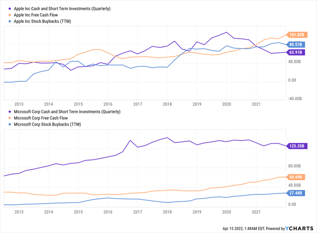 - Buybacks becoming ineffective: At elevated valuations, Apple and Microsoft's buyback programs are getting less effective at boosting FCF per share (stock price). Both Apple and Microsoft have robust balance sheets and free cash flow generation; hence, I continue to think of them as infinite buyback pumps. However, these buybacks may not be enough to defend trading multiples in a rising interest rate environment.