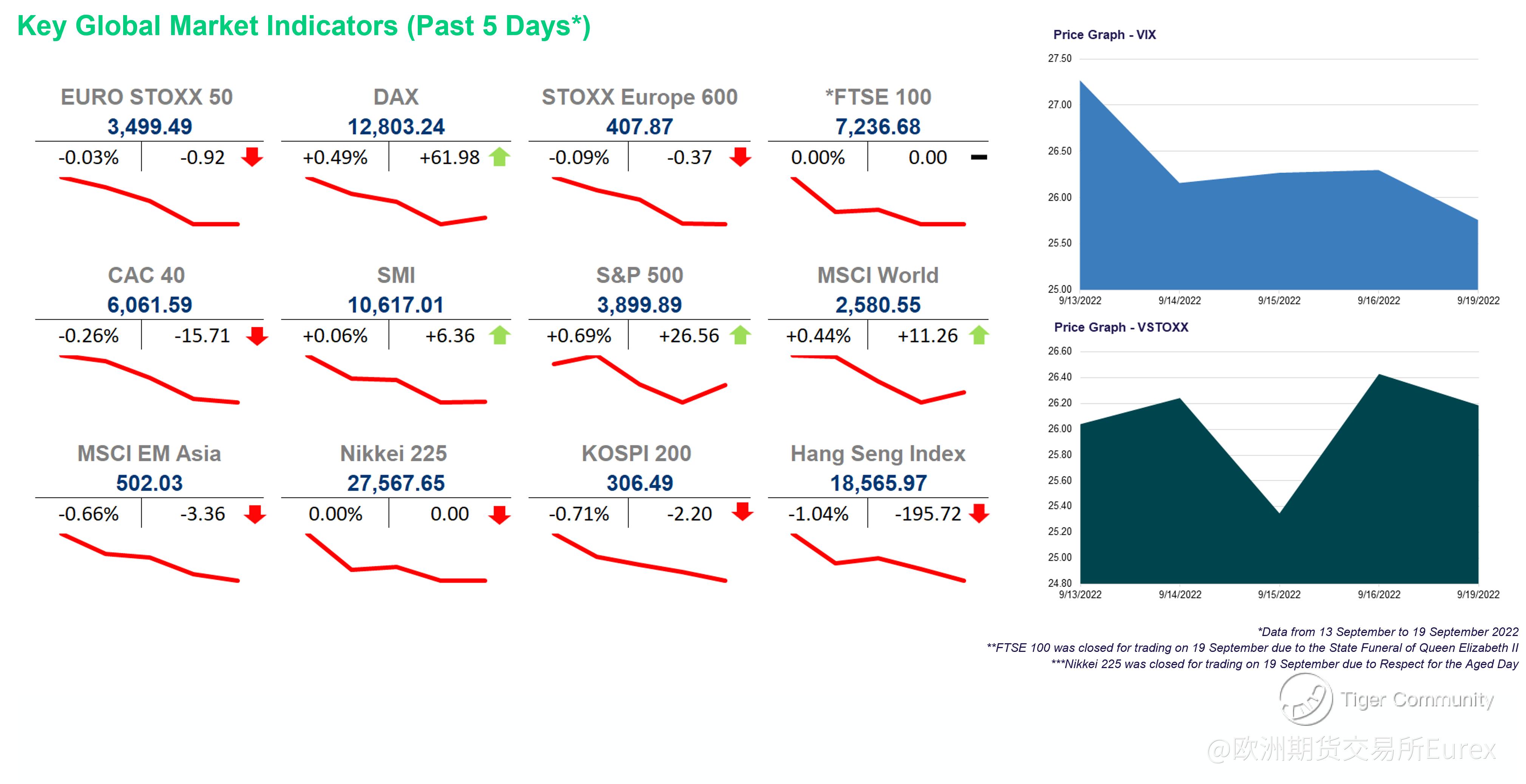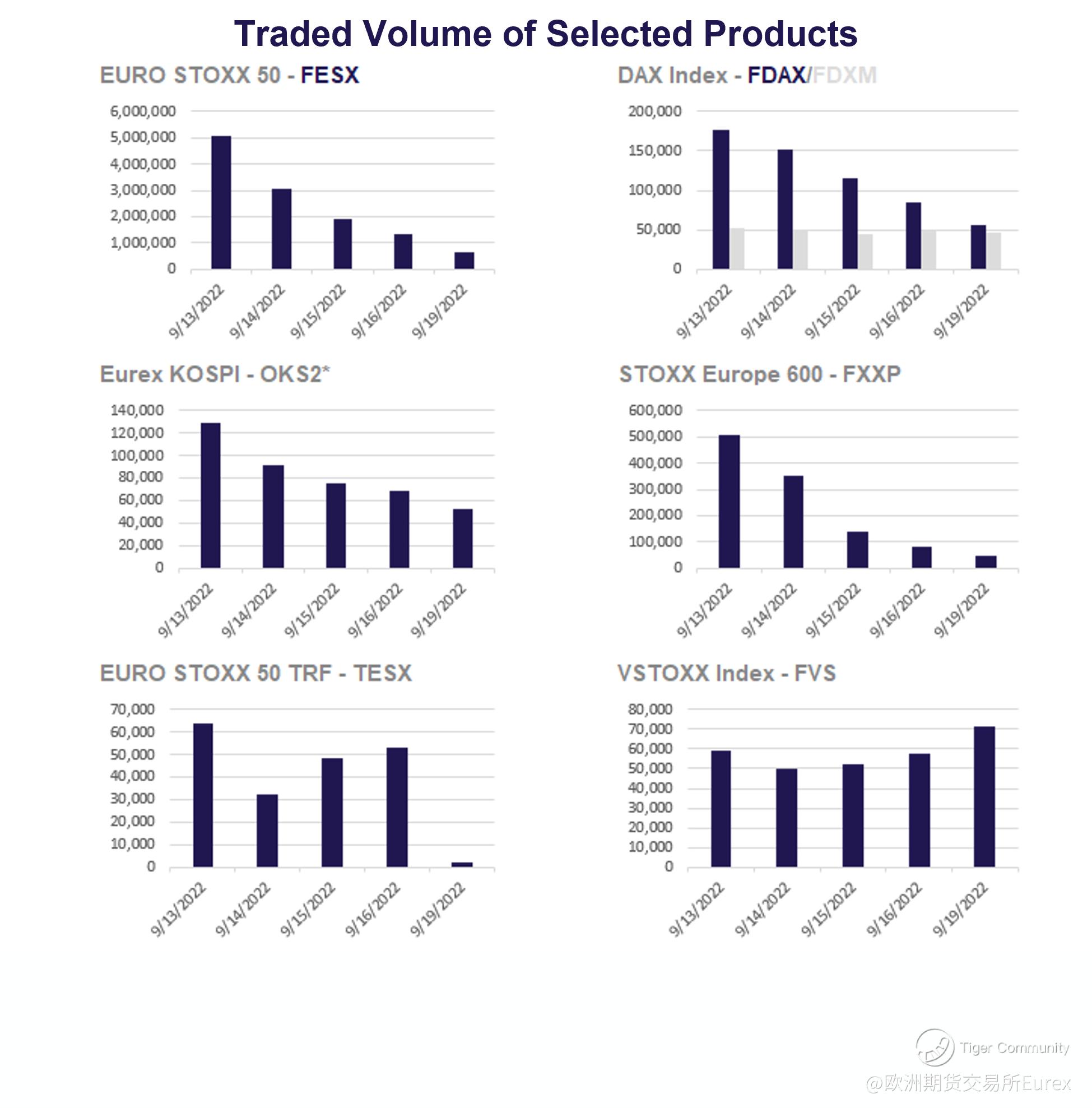 Trading Volume Update: Weekly average volume in EURO STOXX 50® Index Futures reached 2,399,153 lots (EUR 170.6 billion notional) over the past 5 days with a weekly high of 5,068,039 contracts (EUR 363.2 billion notional) on Tuesday (September 13, 2022). Weekly average volume in DAX Futures stood at 116,605 contracts (EUR 75.9 billion notional). Whereas for Mini-DAX futures, weekly average volume stood at 48,281 contracts (EUR 6.3 billion notional).