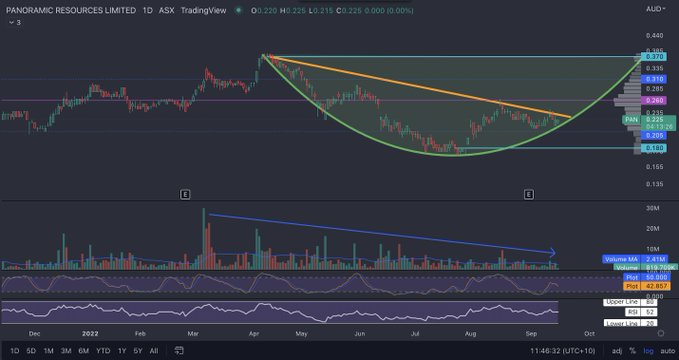 Entered $Panoramic Resources Ltd(PAN.AU)$ for an arc / breakout trade. Like the setup w/ declining vol since March (& also the last few weeks basing here in the low 20s). POC is at 26c across the last ~12M. Adding #nickel exposure probably doesn't hurt either IMO.