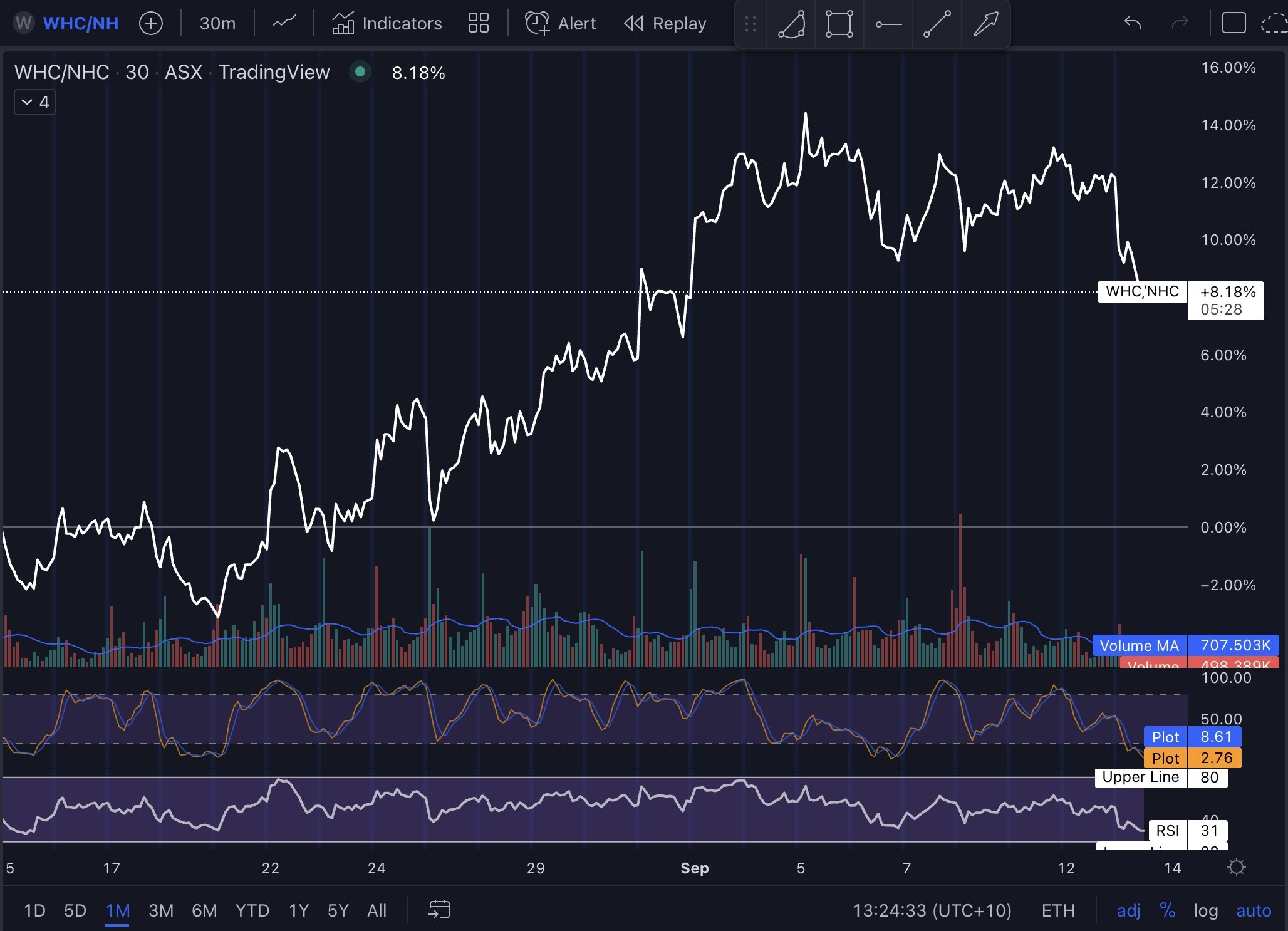 IMO, $($WHC)$ (ex div) to $NHC (cum div) shift is occuring at the moment with savvy investors scalping some short term alpha (45 day holding period for franking entitlement). See 1month chart below #Coal
