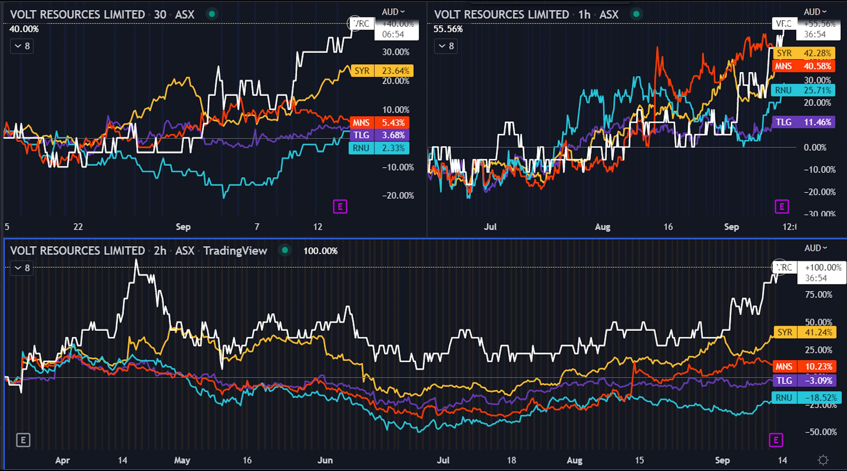 #Graphite peer performance comp. of 5 key names IMO $($VRC)$ $($SYR)$ $($MNS)$ $($TLG)$ $($RNU)$ (yes some are missing but I can't fit them all onto a chart or it gets v messy).