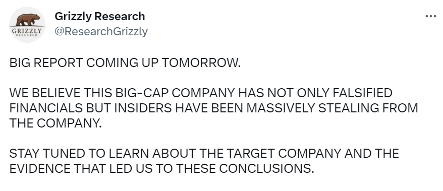 Grizzly Research, a prominent short research, has announced that it will unveil a new "short target" at 11:30 pm EST on March 2 (12:30 am on March 3 Singapore time), according to a recent message released by the firm.