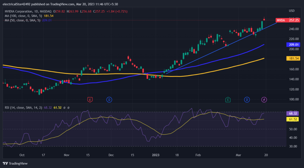 The weekly technical chart ofNVIDIAsuggests a weak upside trend in price. It has been forming an upside trend line on the daily chart. NVDA stock price is currently trading near the value of $257 with a small gain in the intraday session. Resistance of the NVDA stock price can be seen near the value of $300. Meanwhile the support of the asset price can be seen near $225. It is currently trading above the 50 and 100 Daily Moving Average. There can be a positive crossover which can push the asset price to a new high.