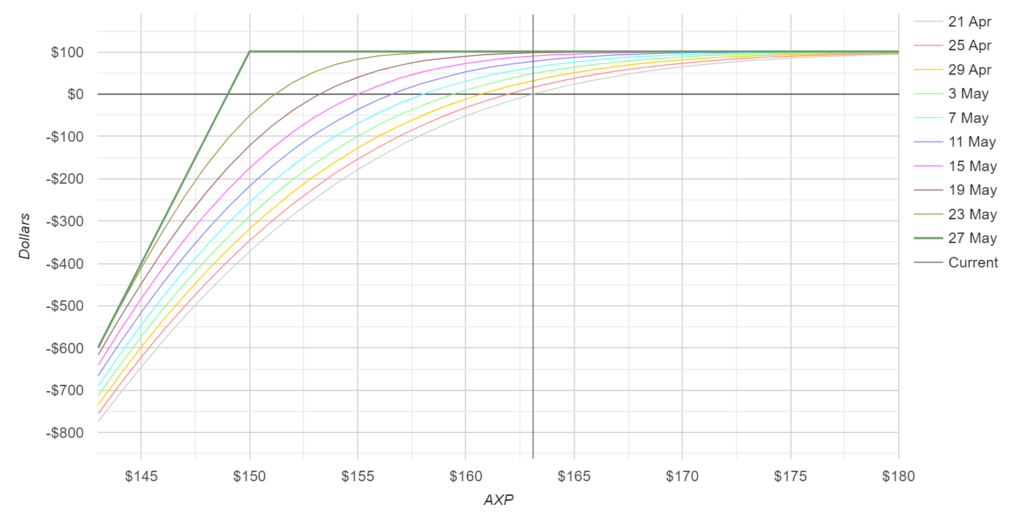 Personally speaking, I am relatively optimistic about AXP's Q2 financial report while also acknowledging market sentiment towards "conservative company provisions." Considering that there is currently greater downward pressure on US stock markets and an over 80% chance of interest rate hikes in May, setting prices slightly below current levels for PUT options may be wise such as selling 150 PUTs expiring on May 26th which has a margin requirement of around $2000 USD with potential returns of $100 USD at expiration date.
