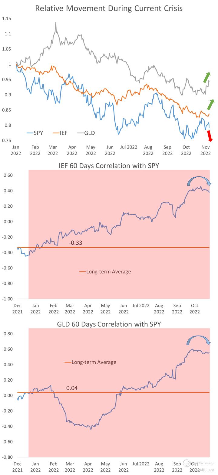 We are beginning to see "flight to safety" dynamics in the market again after a very long time. Stocks were down and US treasuries were up. Gold held steady after jumping the day before. Traditional correlations are showing signs of reverting to normal behavior. Watch the market reaction after the Oct CPI release. It should provide clues as to whether asset allocation is starting to work again.