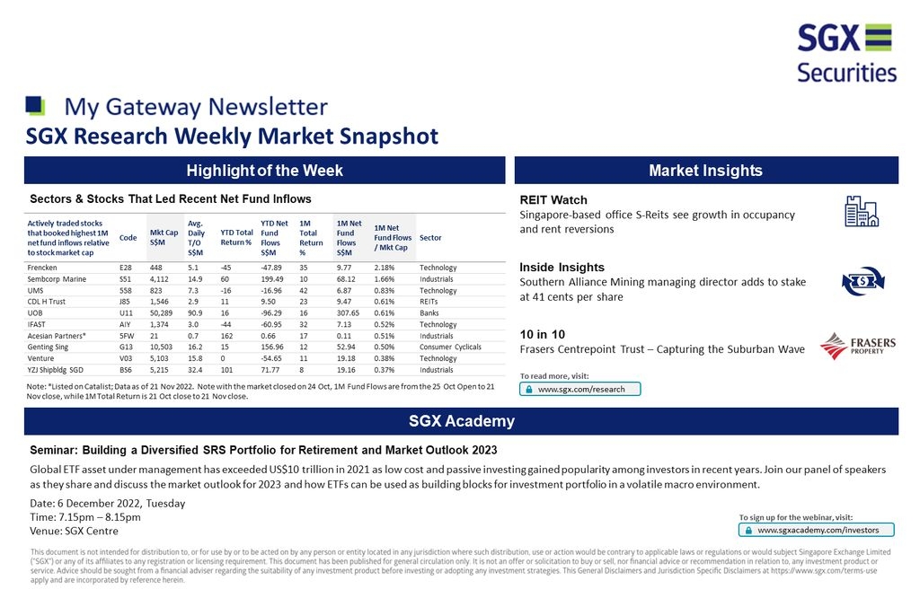 From the 21 Oct to 21 Nov close, $Straits Times Index(STI.SI)$ rallied 9.4%, with Singapore's 100 most traded stocks averaging 8.0% total returns. The 100 stocks also saw S$730M of combined net fund inflows over the month, taking their 2022 YTD net fund inflows to S$1.2B.