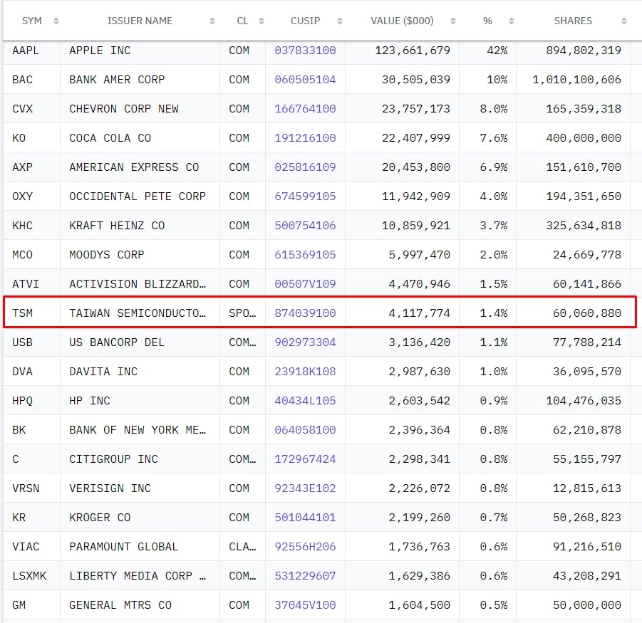 $Berkshire Hathaway(BRK.B)$ bought more than USD 4B of $Taiwan Semiconductor Manufacturing(TSM)$ shares in the third quarter. The purchase of 60 million shares of Taiwan Semiconductor (TSM), the leading contract producer of semiconductors in the world, was the highlight of the latest 13-F report. Those shares are worth USD 4.4 billion based on TSM latest closing price.