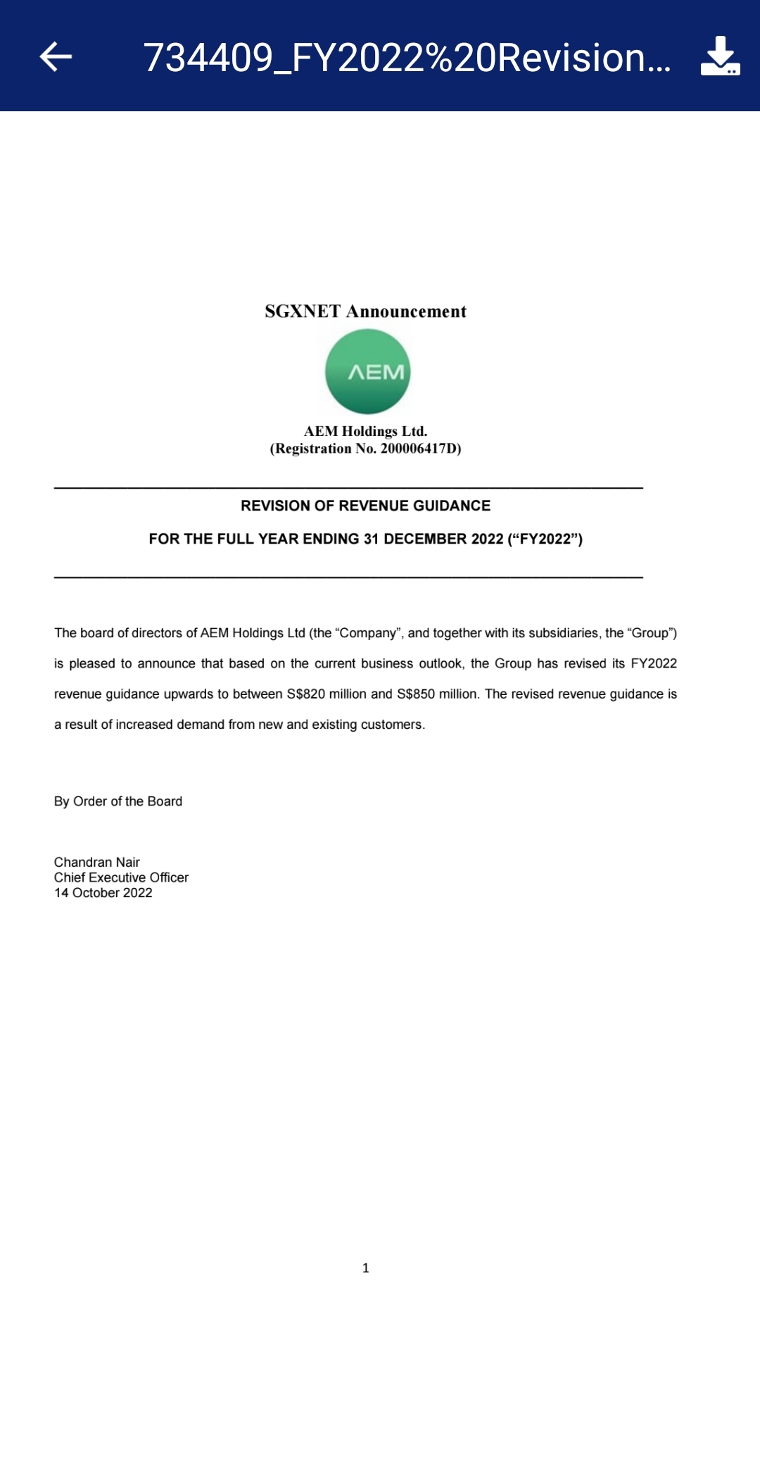 $AEM HOLDINGS LTD(AWX.SI)$FY 2022 revenue guidance revised upwards from $750 - $800 million to $820 - $850 million. Past few days sell off were mainly due to expectations of lower revenue due to the new USA restrictions of selling semiconductor to China, the revised revenue guidance should fairly support the stock price.