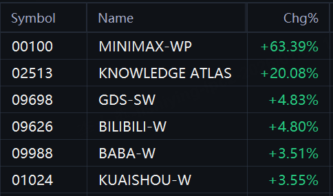 Chinese AI model developers shares jumped in Hong Kong. MiniMax rose 63%; Knowledge Atlas rose 20%; GDS Holdings and Bilibili rose 5%; Alibaba and Kuaishou rose 4%.