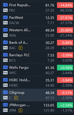 Bank stocks extended their losses in premarket trading; First Republic Bank, PacWest, Western Alliance tumbled over 66%, 37% and 27% separately.