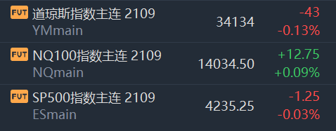 6月16日,美国三大股指期货涨跌不一,截至发稿,道指期货跌0.13%;标普500指数期货跌0.03%;纳斯达克100指数期货涨0.09%。