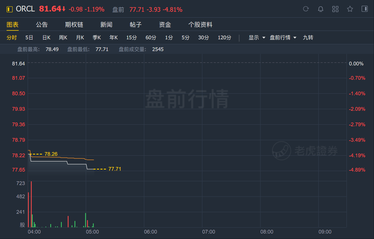 甲骨文盘前跌近5%,业绩指引低于预期;