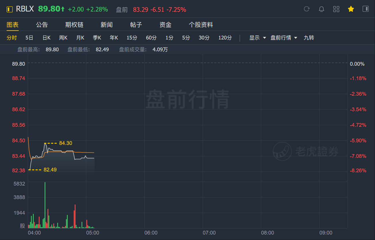 Roblox盘前跌7.25%,此前公布5月营收环比下滑11%,日活用户为4300万,环比下滑1%.