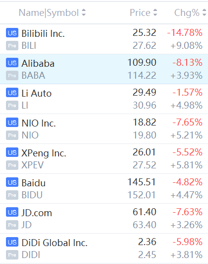 Alibaba, Bilibili, DiDi, JD.com, Baidu, Li Auto, Xpeng, and NIO rise between 3% and 9%.