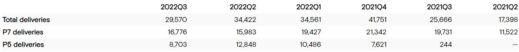 - Deliveries of the P7 smart sports sedan were 16,776 in the third quarter of 2022, representing a decrease of 15% from 19,731 in the corresponding period of 2021.