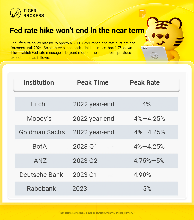 The hawkish Fed rate message is beyond most of the institutions’ previous expectations as follows:In its quest to bring down inflation running near its highest levels since the early 1980s, the central bank took its federal funds rate up to a range of 3%-3.25%, the highest it has been since early 2008 following the third consecutive 0.75 percentage point move.