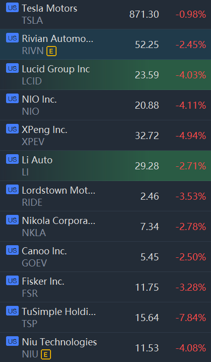 EV stocks dropped in morning trading. Tesla, Rivian, Lucid, Nio, XPeng, LI Auto, Lordstown, Nikola, TuSimple, Canoo and Fisker fell between 1% and 7%.