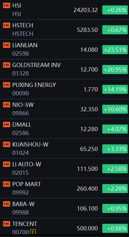 LIANLIAN and Goldstream Investment soared over 20%; PUXING ENERGY and NIO-SW up over 10%; LI AUTO-W and POP MART up 2%.