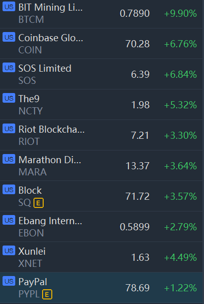 Crypto stocks jumped in morning trading. BIT Mining, Marathon Digital, Coinbase, SOS Limited, The9, Riot Blockchain, Block, Ebang International and PayPal climbed between 1% and 10%.