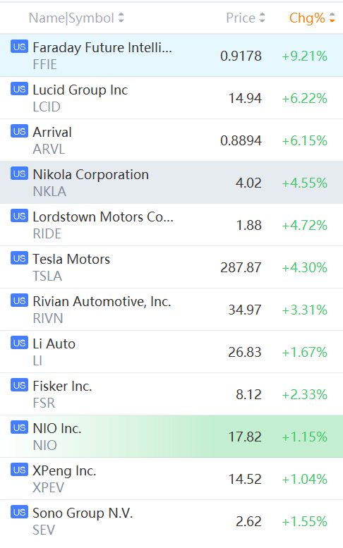 Lordstown, Li Auto, Fisker, Nikola, Arrival, Nio, Rivian, Faraday Future and Lucid rose from 1% to 9%.