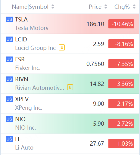 Tesla tumbled over 10%; Lucid, Fisker fell over 7%; Rivian fell over 3%; Nio, XPeng fell over 2%.