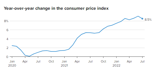 Prices that consumers pay for a variety of goods and services rose 8.5% in July from a year ago, a slowing pace from the previous month due largely to a drop in gasoline prices.