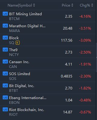 Crypto stocks fell in morning trading,with BIT Mining and Marathon Digital sliding around 4%.Bitcoin dumped to a monthly low beneath $39,000, and the crypto market cap declined by about $80 billion in a day.