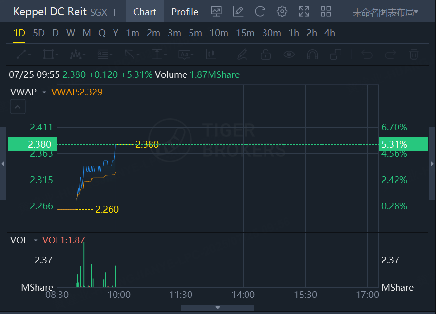 Keppel DC Reit soars 5.31% at 9:55 am, July 25th.