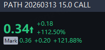 There are 283,517 UiPath option contracts traded on Wednesday, fout times higher than the previous trading day. Call options account for 81% of overall option trades. Particularly high volume was seen for the $15 strike call option expiring March 13, with 24,661 contracts trading. $PATH 20260313 15.0 CALL$